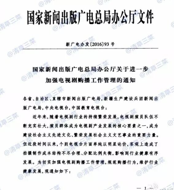 國家新聞出版廣電總局辦公廳發布《國家新聞出版廣電總局辦公廳關于進一步加強電視劇購播工作管理的通知》(新廣電辦發〔2016〕93號)。