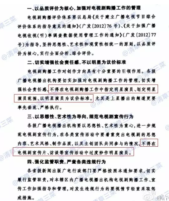 《通知》要求進一步加強電視劇購播工作管理,規范電視劇購播評價體系、議價標準以及電視劇宣傳行為等。要求各級電視播出機構在電視劇購播過程中不得指定演員、不得以明星大腕作為議價標準,在電視劇宣傳工作中不得對明星進行過度炒作。