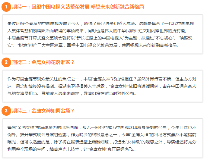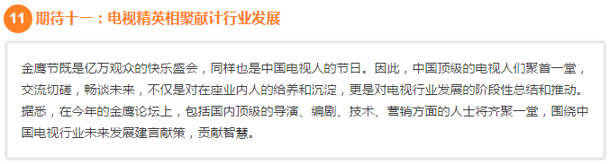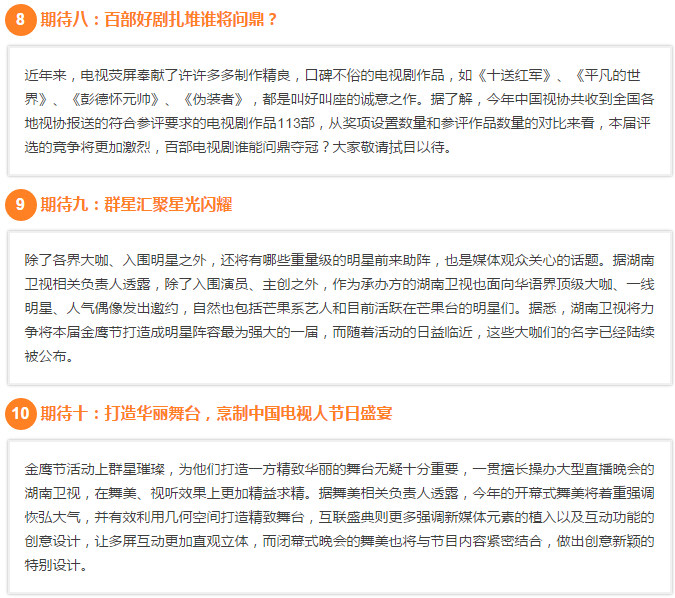 創新、融合、發展,是近年來擺在中國電視人面前最大的課題之一。十八大以來,尤其是習總書記關于文藝工作的一系列講話,極大振奮和鼓舞了中國電視人共筑中國夢的信心和決心。據悉,中國最頂級的電視人和眾多跨界的精英人士將在今年的“金鷹節”上濟濟一堂,通過5大主體活動,梳理總結兩年來的收獲與成果,并為中國電視的未來描繪壯麗藍圖。同時也讓觀眾們對今年金鷹節的舉辦翹首以待。