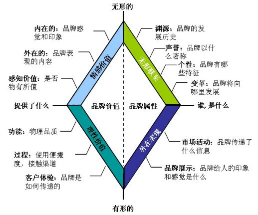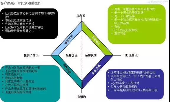 這個工具通過消費者調(diào)研,大家可以發(fā)現(xiàn)自己品牌在消費者頭腦中的印象,就是品牌資產(chǎn),看看我們給消費者是怎樣的印象,這些印象哪些是品牌負(fù)債,那些是正資產(chǎn),那些是當(dāng)初細(xì)分客群需要但是我們沒有提供的。