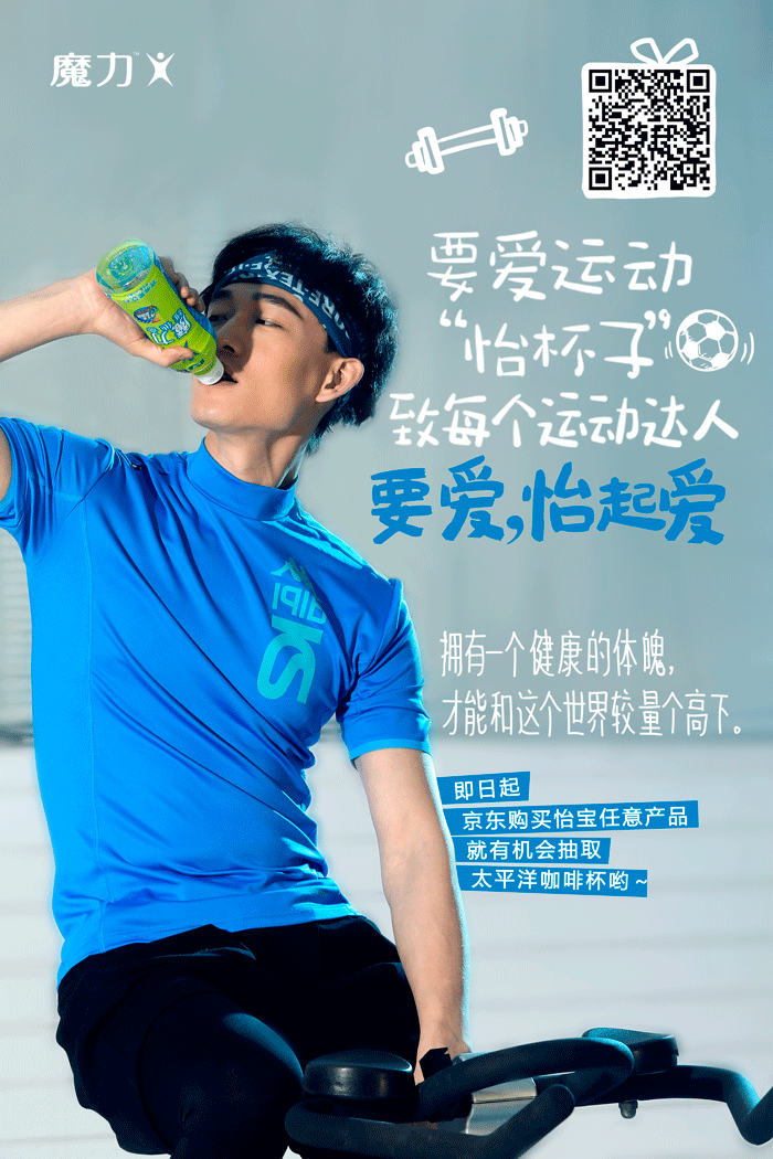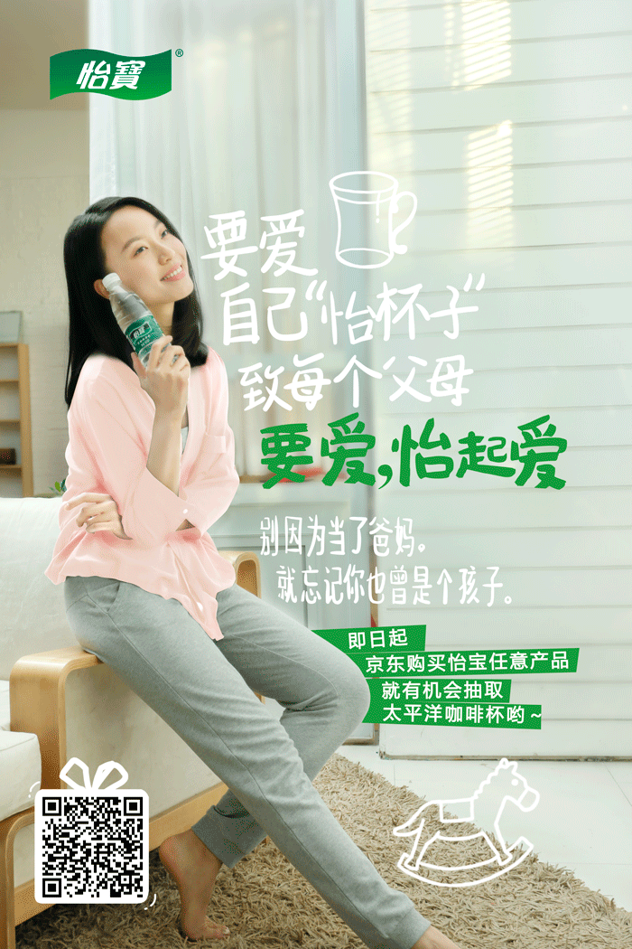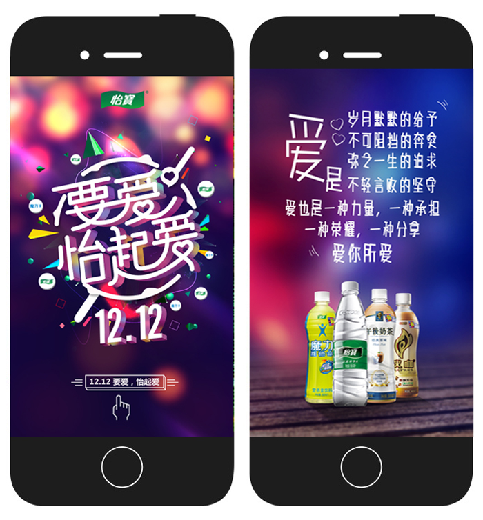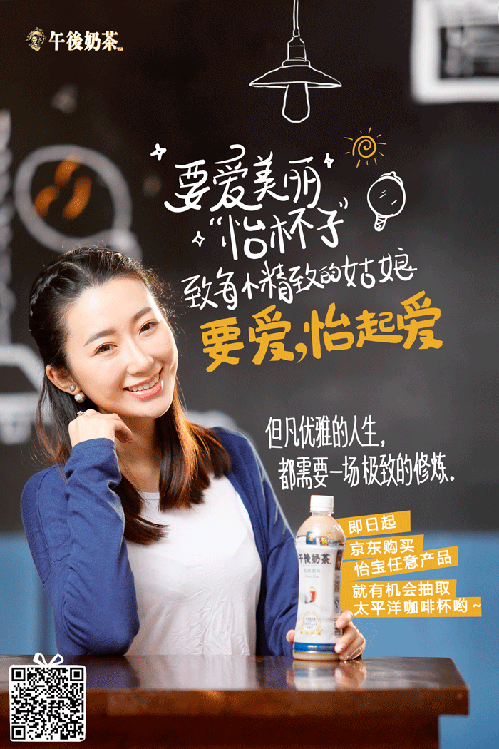 2016年怡寶在雙十二期間發布了“愛怡起活動”,將主題分為4個怡寶、魔力、火咖、午后奶茶分別結合了4款不同產品,結合品牌調性以真人場景化拍攝的形式發布了4張海報。同時在海報中加入了二維碼有效的對電商進行引流。