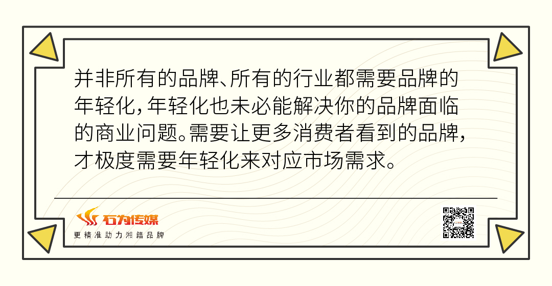 品牌通常是為讓年輕人看到、抓住年輕消費(fèi)者群體而進(jìn)行的年輕化推進(jìn),聽(tīng)上去很合理,實(shí)際上并非所有的品牌、所有的行業(yè)都需要品牌的年輕化,年輕化也未必能解決你的品牌面臨的商業(yè)問(wèn)題。