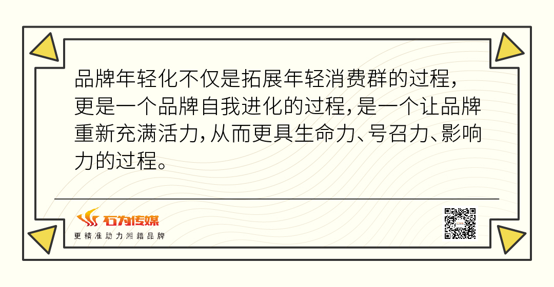 石為傳媒在與大部分企業(yè)品牌的前期溝通過(guò)程中發(fā)現(xiàn),很多品牌都想通過(guò)不斷地年輕化迭代,保持品牌活力,不被“新”時(shí)代的消費(fèi)者拋棄。傳統(tǒng)品牌洗心革面,不遺余力的去爭(zhēng)奪年輕人的市場(chǎng),卻往往總是不得其法,賣力不討好。品牌年輕化固然重要,但很多品牌經(jīng)常誤解這件事的本質(zhì)和核心,對(duì)于鑄造品牌年輕化存在一些誤區(qū)。