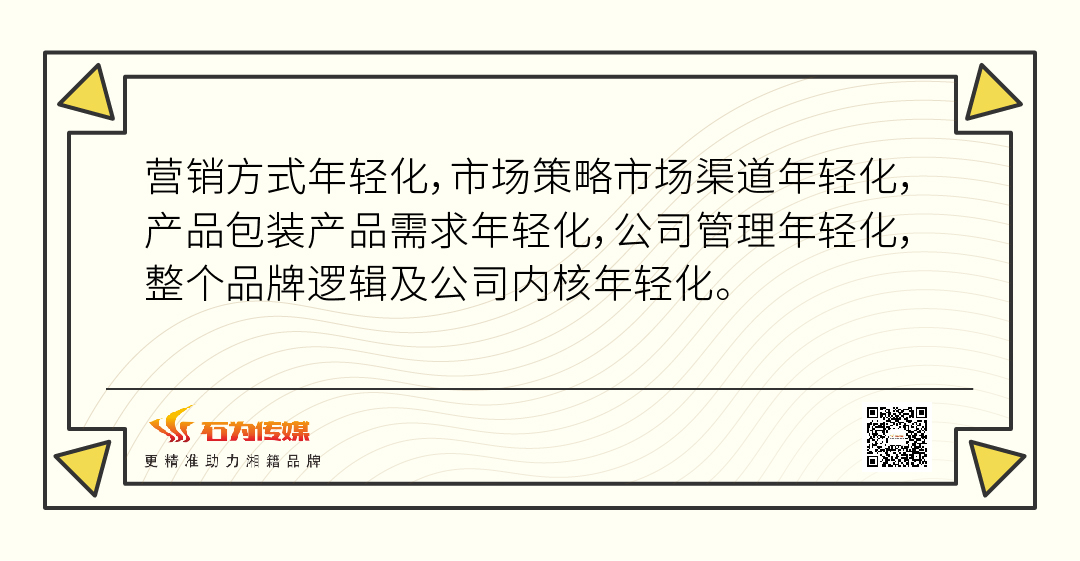 品牌年輕化其實(shí)還會(huì)牽扯到企業(yè)的整個(gè)管理方面、流程方面的事情,因?yàn)閷?duì)于品牌的年輕化來(lái)說(shuō),問(wèn)題以及不單單是指?jìng)鞑セ驅(qū)徝栏母铩I踔習(xí)紤],品牌產(chǎn)品年輕化改革,品牌公司年輕化的變革等等的細(xì)枝末節(jié),真正的年輕化往往會(huì)需要傷筋動(dòng)骨。但只要狠得下心,往往會(huì)涅槃重生。
