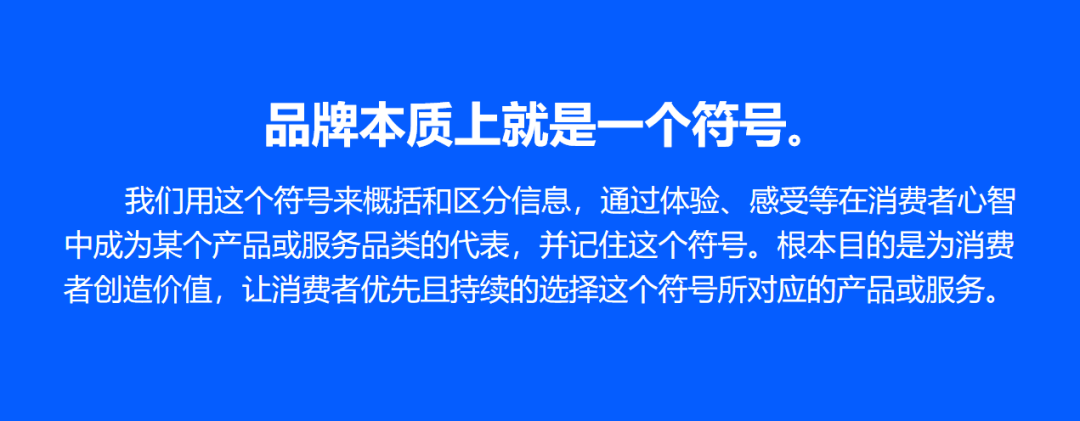 品牌本質(zhì)上是一個符號。我們用這個符號來概括和區(qū)分信息,通過體驗、感受等在消費者心智中成為某個產(chǎn)品或服務(wù)品類的代表,并且讓消費者記住這個符號。根本目的是為消費者創(chuàng)造價值,讓消費者優(yōu)先且持續(xù)選擇這個符號所對應(yīng)的產(chǎn)品或服務(wù)。